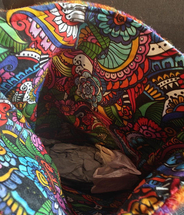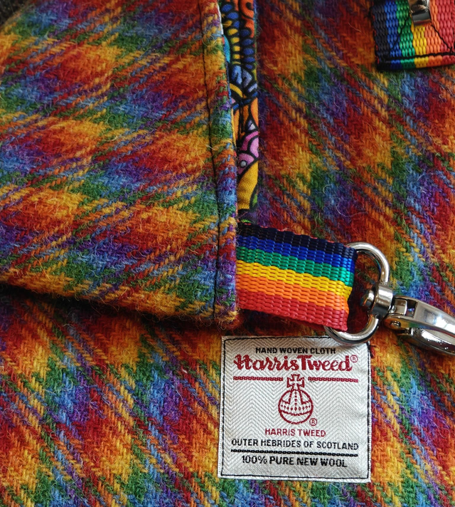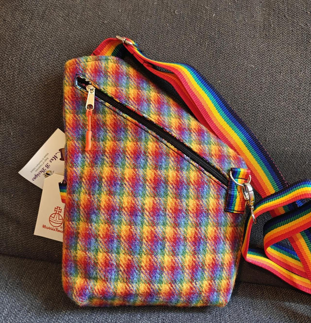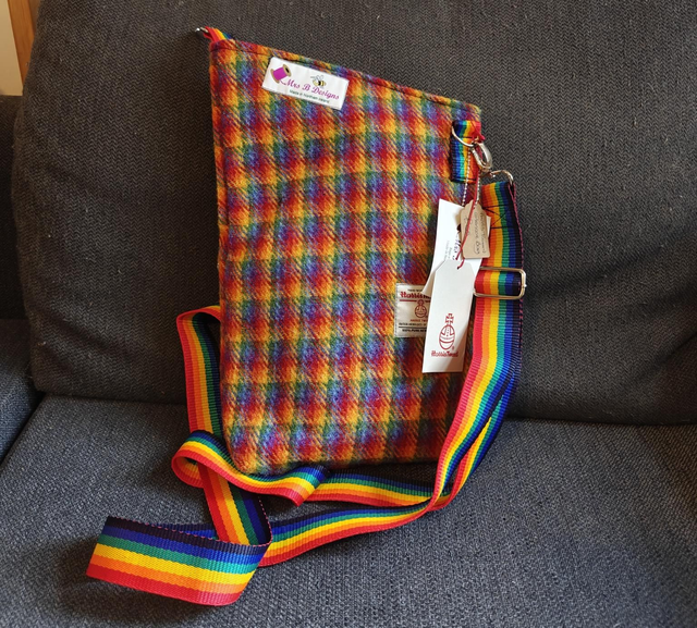 A Glencoe bag in these lovely rainbow check. I've teamed it with a bright print craft cotton for the lining. Zipped rear pocket and fold over clip fastening. Adjustable patterned contrasting 38mm wide webbing handle. Size is 35cm opened up long side, 29cm short side, 25cm wide.