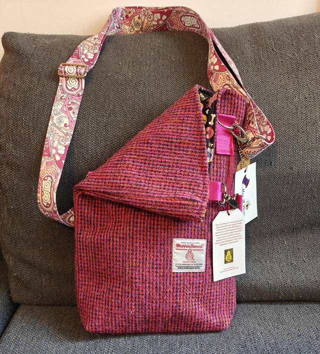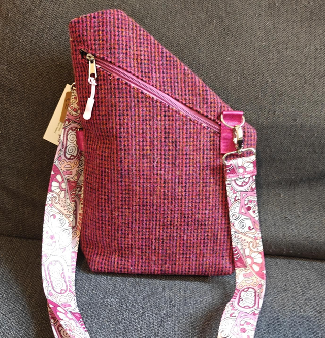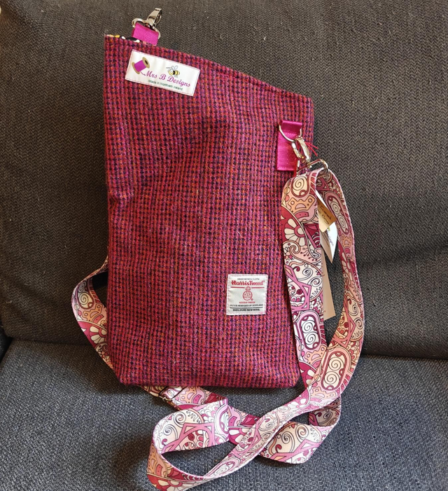 A Glencoe bag in these rich red tones of harris tweed. I've teamed it with a craft cotton for the lining. Zipped rear pocket and fold over clip fastening. Adjustable patterned contrasting 38mm wide webbing handle. Size is 35cm opened up long side, 29cm short side, 25cm wide.