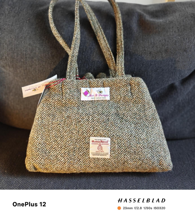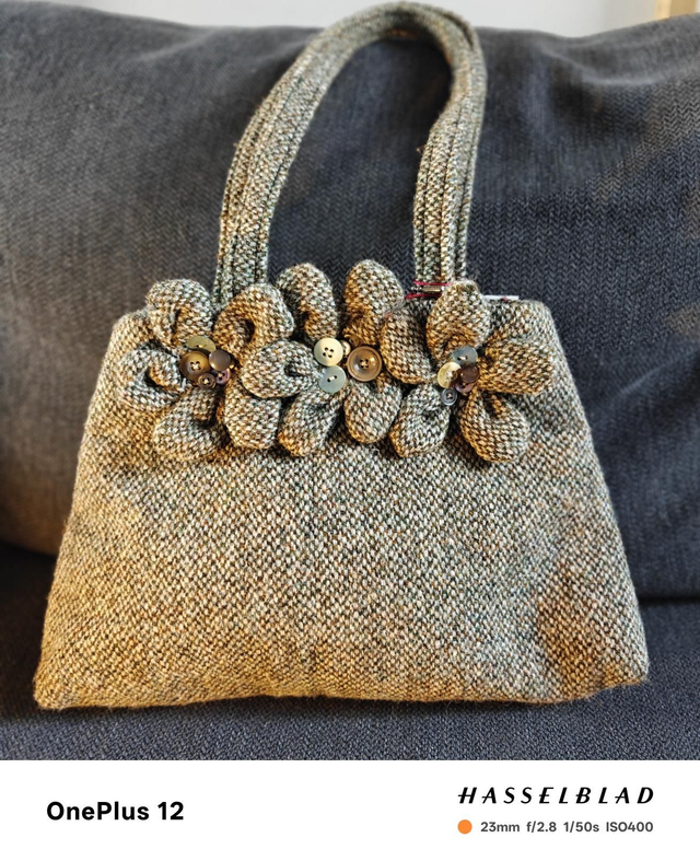 This lovely oatmeal coloured Harris Tweed bag is a new design still in development. It has tweed handles that you could carry over your shoulder. It's lined with cotton and has an inner zipped pocket. Size is 23cm high and 33cm wide at bottom and 22cm wide at the top. It's trimmed with tweed flowers and decorated with buttons.