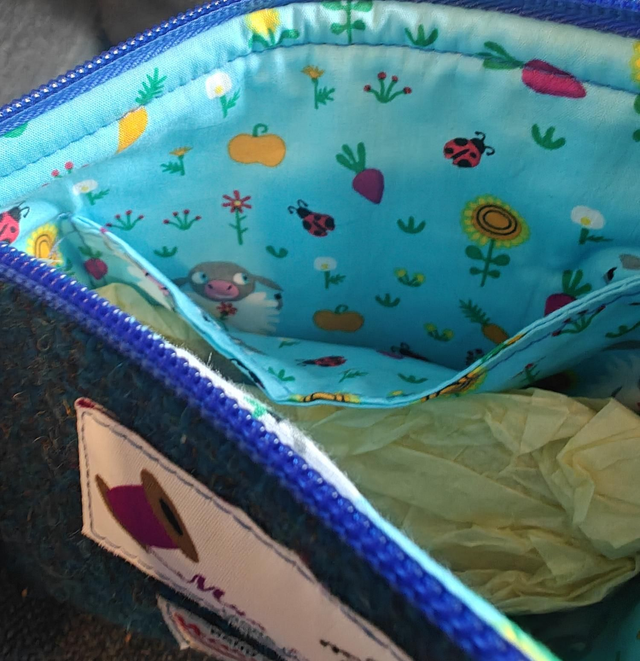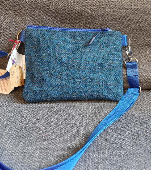 Don't want to be saddled with a large bag then this is the perfect alternative. The Nairn bag. It is the perfect size for phone, purse, passport, lippy. This small cross body bag is safe and secured with it's top zip. Small inside pocket. You could wear it under your coat for extra security. The cross body strap is fully adjustable. Lining is craft cotton. Outer is Harris Tweed. Size height 18cm width 23cm